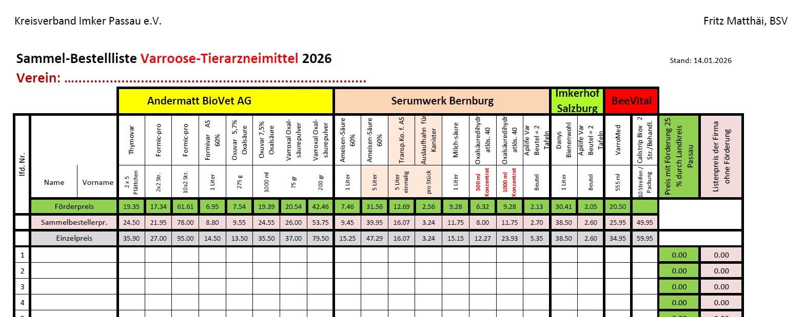 Bestellungen Imkerhof Salzburg und Bee Vital bis 25. März, alle anderen Mittel bis 25. April möglich. Die Mittel werden wieder mit 25% des Preises vom Landkreis Passau bezuschusst.